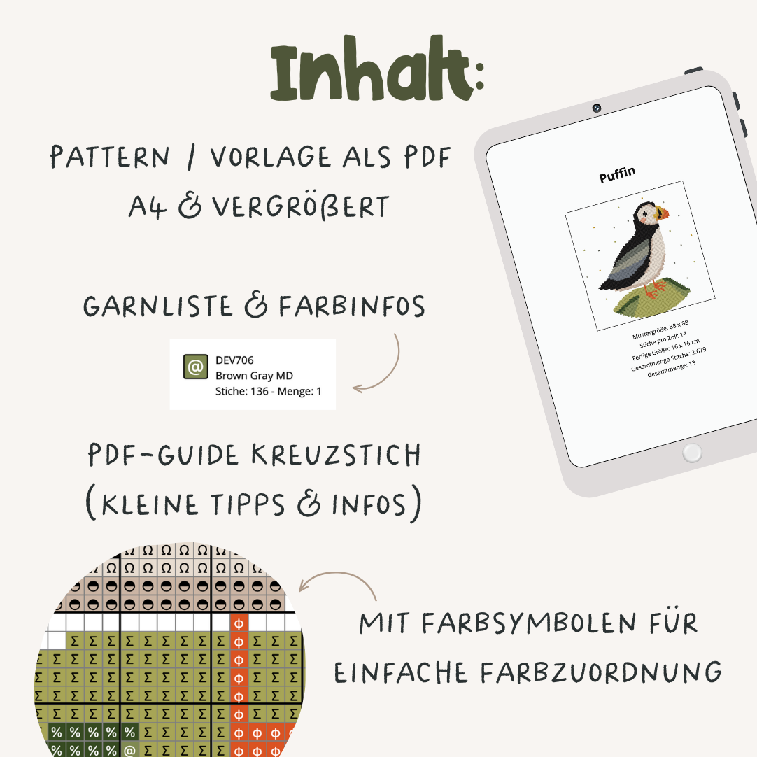 Puffin Cross Stitch Pattern PDF - Papageientaucher Island Kreuzstich-Vorlage