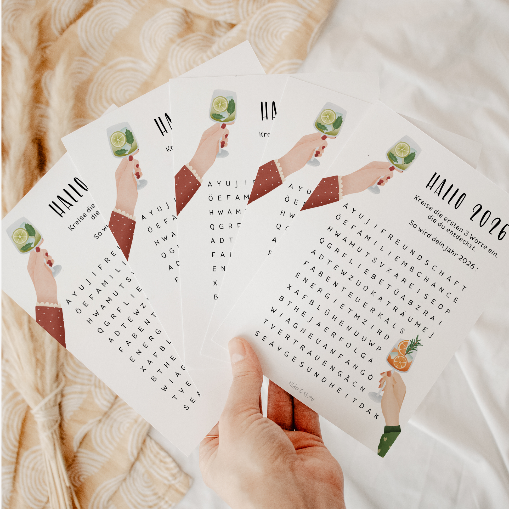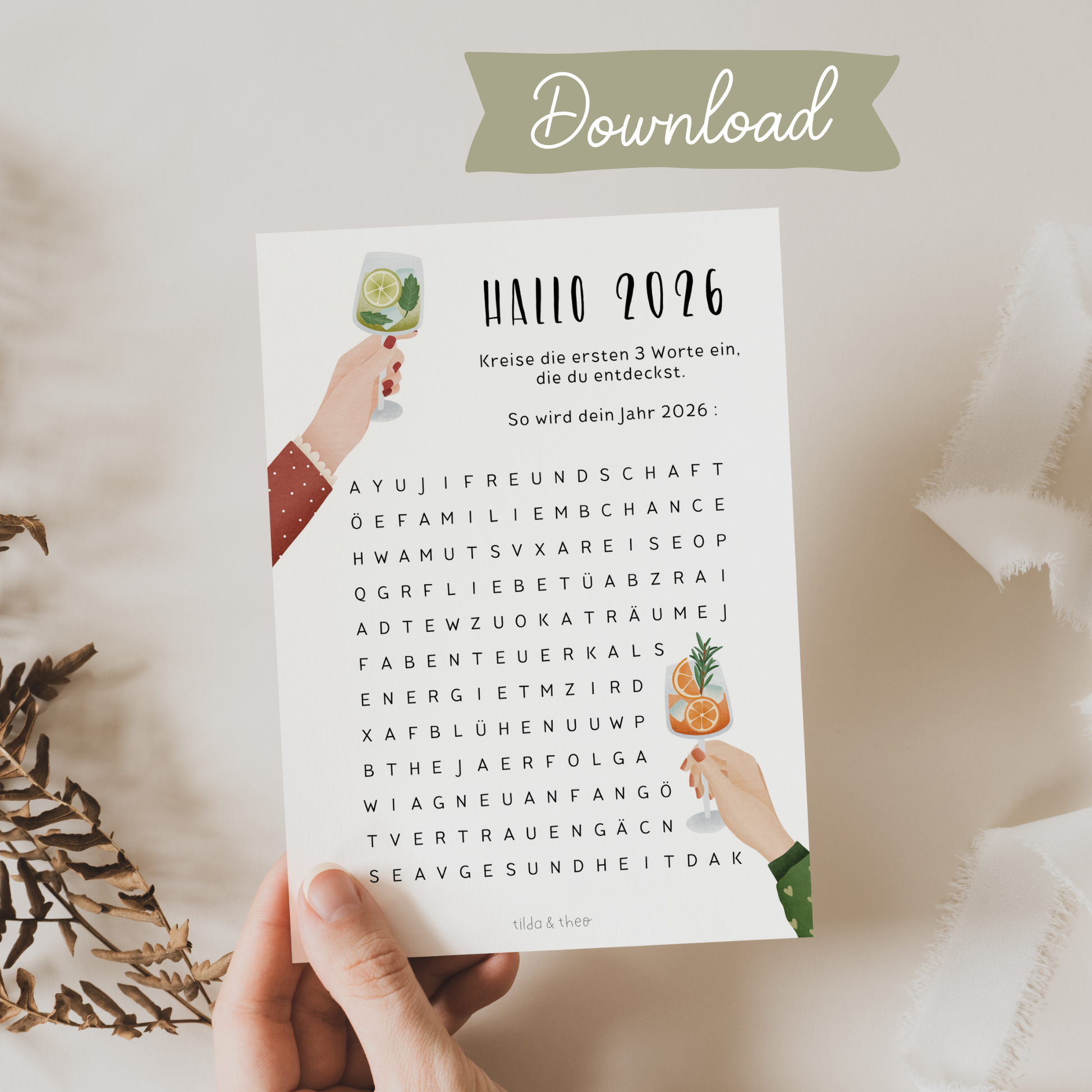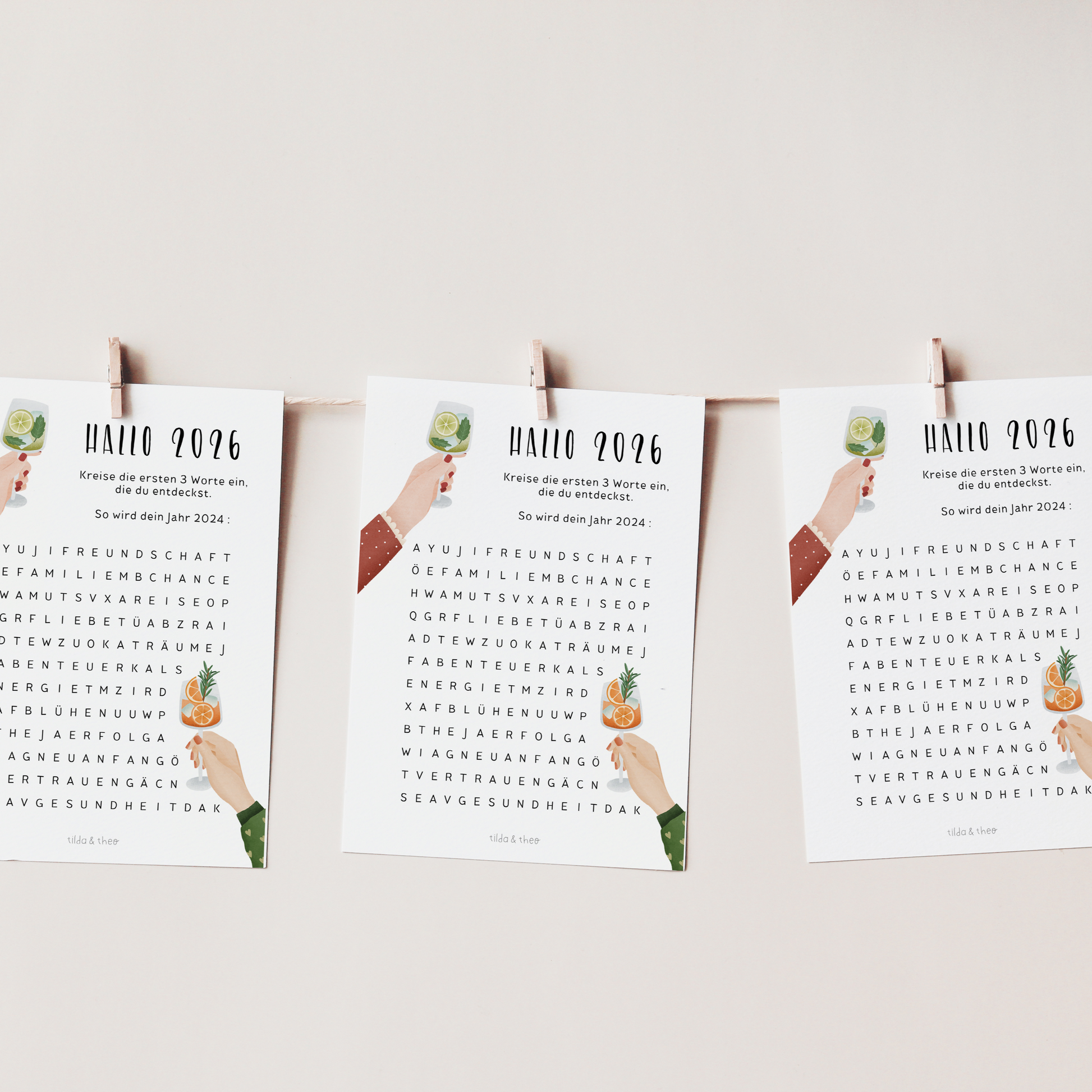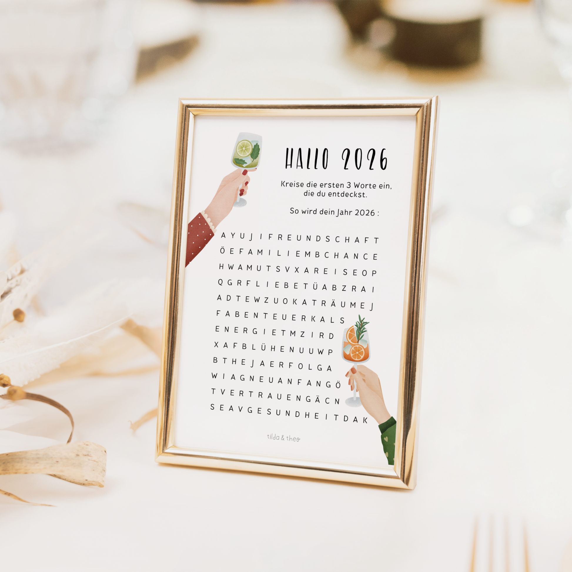 SILVESTER Orakel 2026 Wortsuche zum AUSDRUCKEN Gastgeschenk Neujahr Postkarte