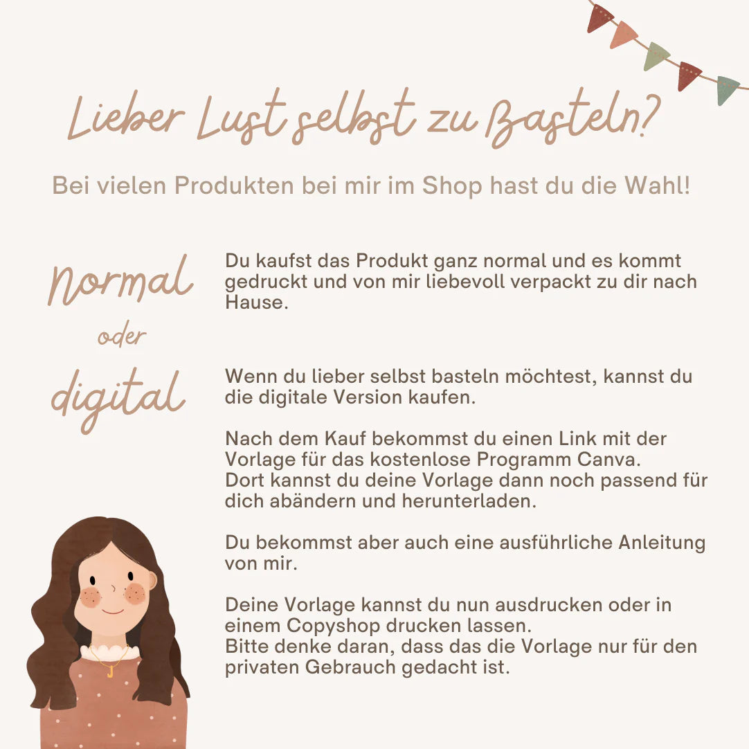 Bei manchem Produkten kannst du eine digitale Version kaufen. Schau gerne immer in die Produktbeschreibung für ausführliche Infos. Die digitale Version ist entweder eine PDF & PNG-Datei oder eine Vorlage für Canva, worin die Infos selbst abändern und danach selbst drucken kannst (zum Beispiel eine Einladung.)