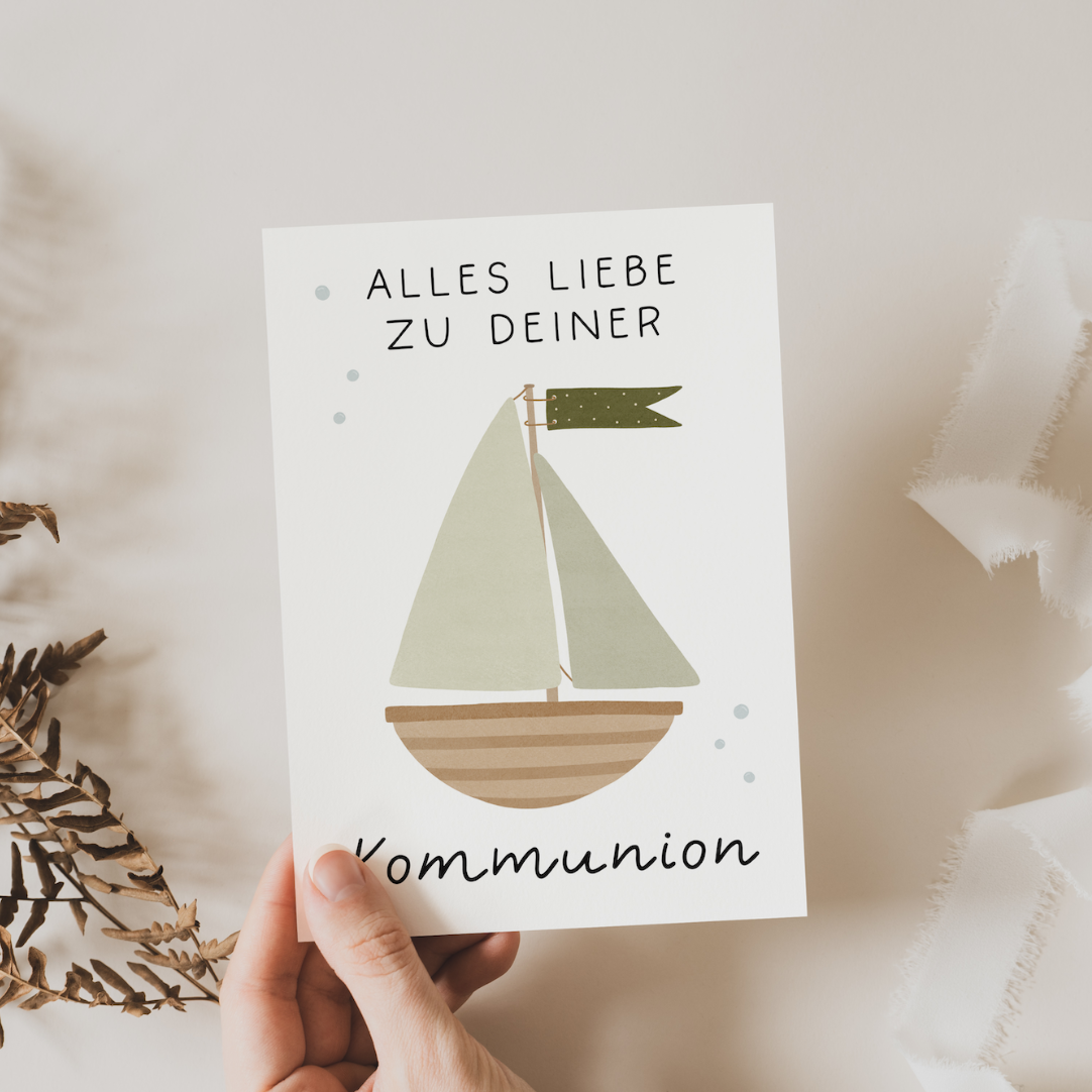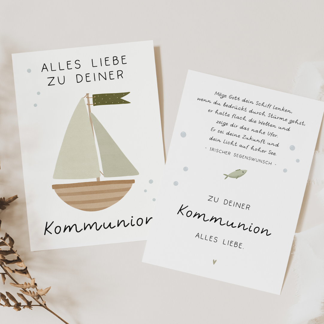 Postkarte Boot Kommunion mit Spruch - Kommunionskarte Schiff