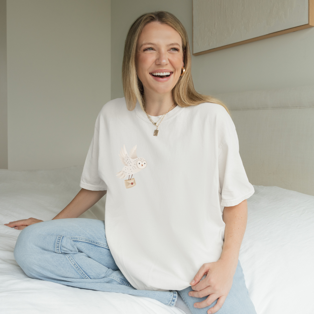 T-Shirt Schneeeule mit Brief BIOBAUMWOLLE Waldtier Eule Shirt - Geschenk Lesen Magie